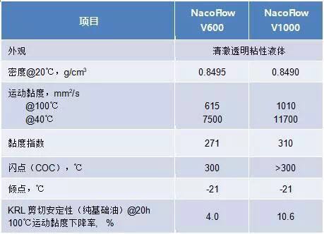超高黏度茂金屬PAO(mPAO)基礎油在黏度指數、低溫流動性、剪切安定性等多方面具有優異的性能,可作為黏度指數改進劑用于車輛齒輪油中,改進剪切安定性。目前,上海納克已商業化兩個超高黏度mPAO產品NacoFlow V600和NacoFlow V1000,100℃運動黏度分別達到了600mm2/s和1000mm2/s,目前國際上還沒有第二家能提供同等黏度的商業化mPAO產品。NacoFlow V600和V1000的基本性能見表1。NacoFlow V600與V1000比較,黏度較小,所以其剪切安定性更好,其在車輛齒輪油中具有更好的應用前景。