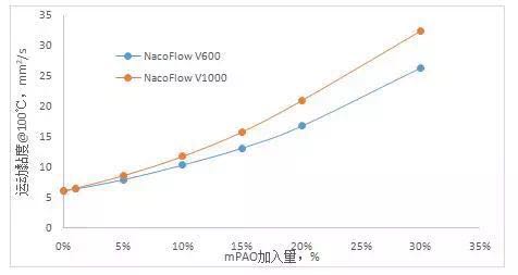 從圖1曲線看,在150N的III類基礎油中,加入20%的NacoFlow V600,油品100℃運動黏度就可以達到16mm2/s以上,說明NacoFlow V600具有良好的增稠能力,NacoFlow V1000比V600具有更大的黏度,其增稠能力更強。